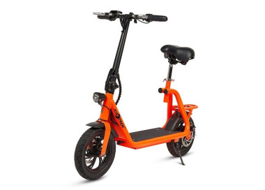 Patinete eléctrico 350W con sillín en color verde y naranja fluorescente. Es moderno y cómodo gracias a su sillín. Disfruta de tus paseos por la ciudad con el nuevo patinete ecológico.