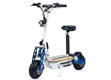 Puedes elegir entre tu patinete eléctrico Sparrow con sillín de color blanco con tonos azul o negro con tonos madera. Ambos presentan un diseño moderno y urbano. Elige el que más te guste.